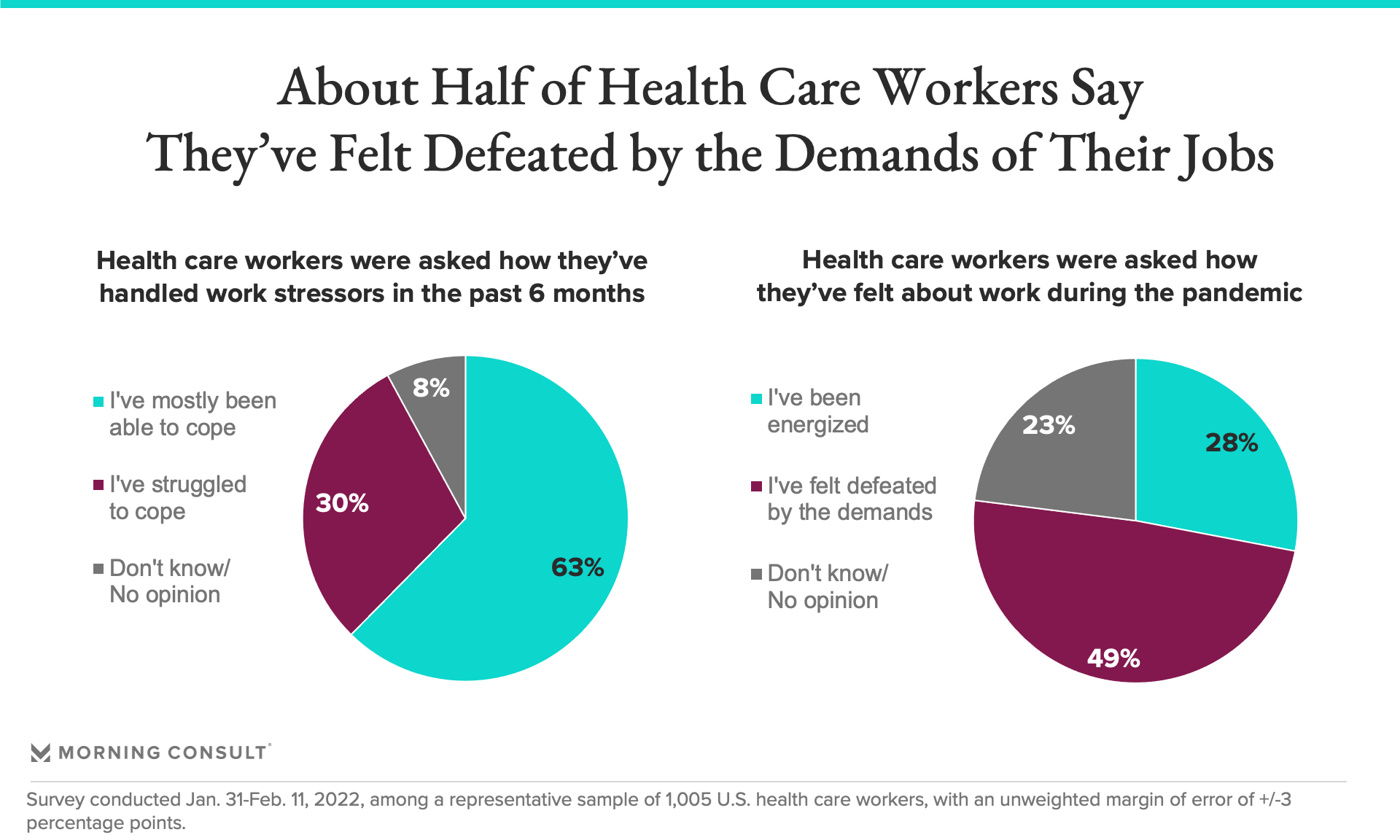 A new Morning Consult/Axios survey indicates half of health care workers have felt defeated by the demands of their jobs during the pandemic, while another 30 percent have struggled to cope with work stressors over the past six months. The findings come as policymakers and health care executives scramble to stem the bleeding while they eye longer-term initiatives to revitalize the medical workforce.