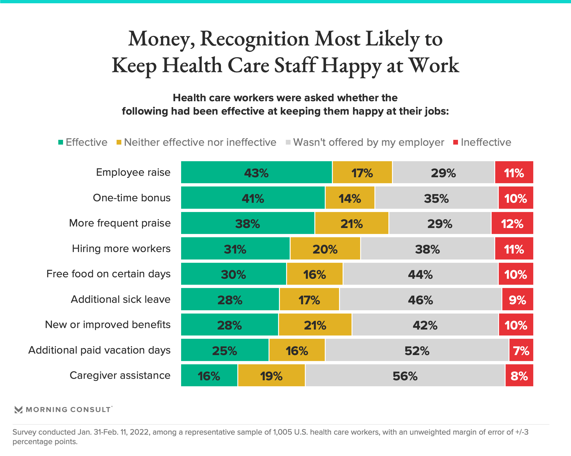 43% of health care workers said getting a raise had helped keep them happy at work during the pandemic, while 38% said as much about more frequent praise from their bosses.