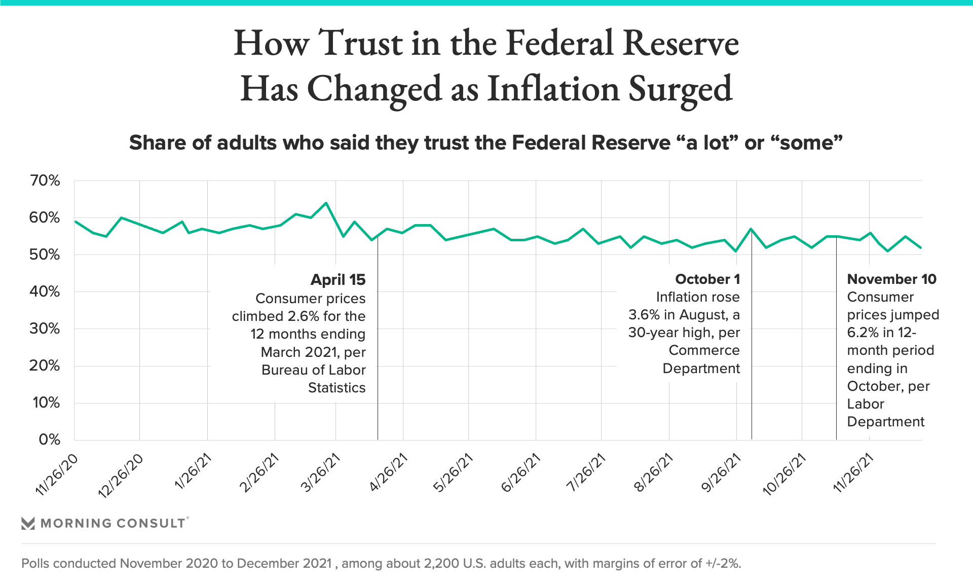 52% of U.S. adults have “a lot” or “some” trust in the Federal Reserve, a 12-point decline since mid-March amid rising prices.