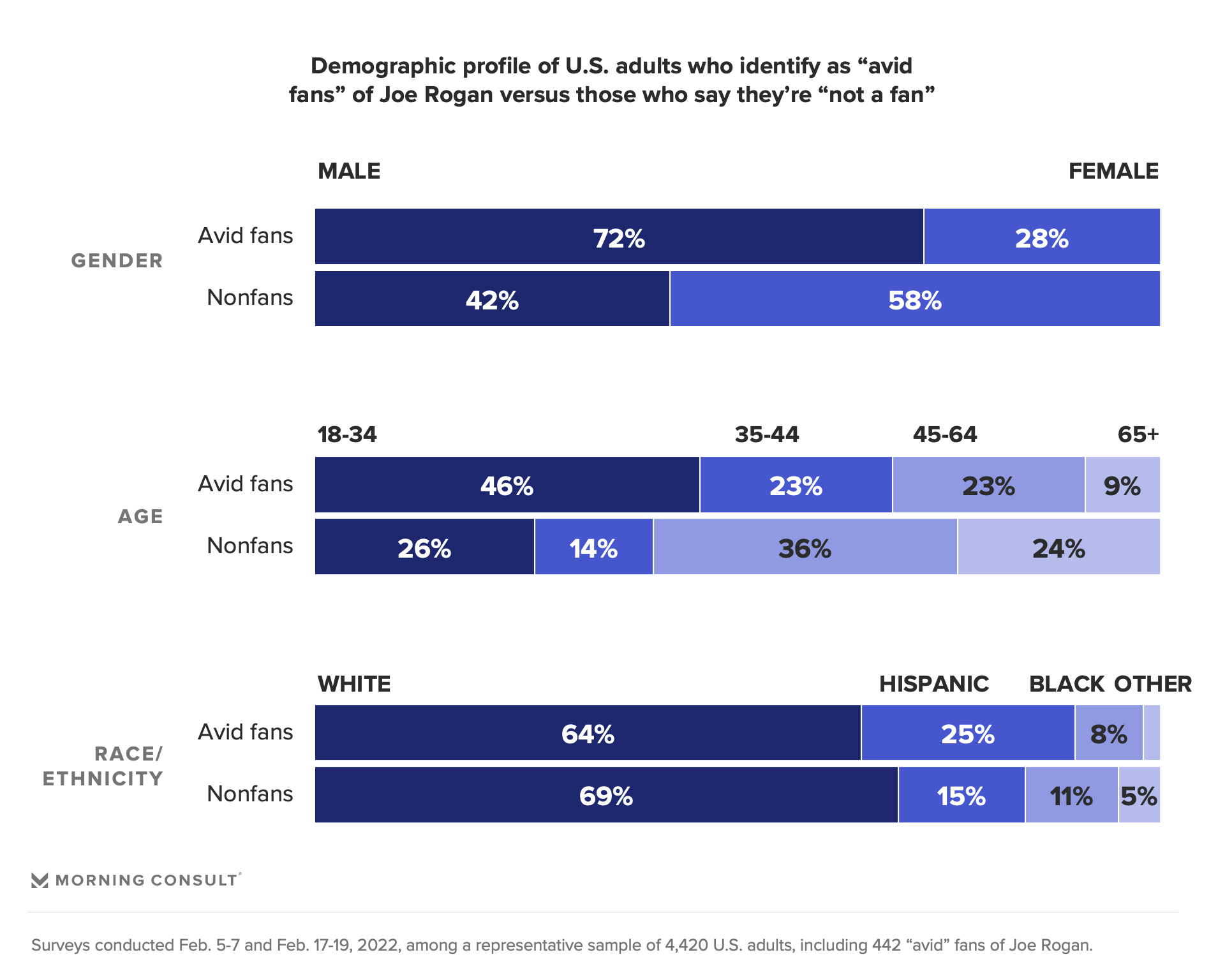 7 in 10 avid Rogan fans are men, and a similar share are under the age of 45.