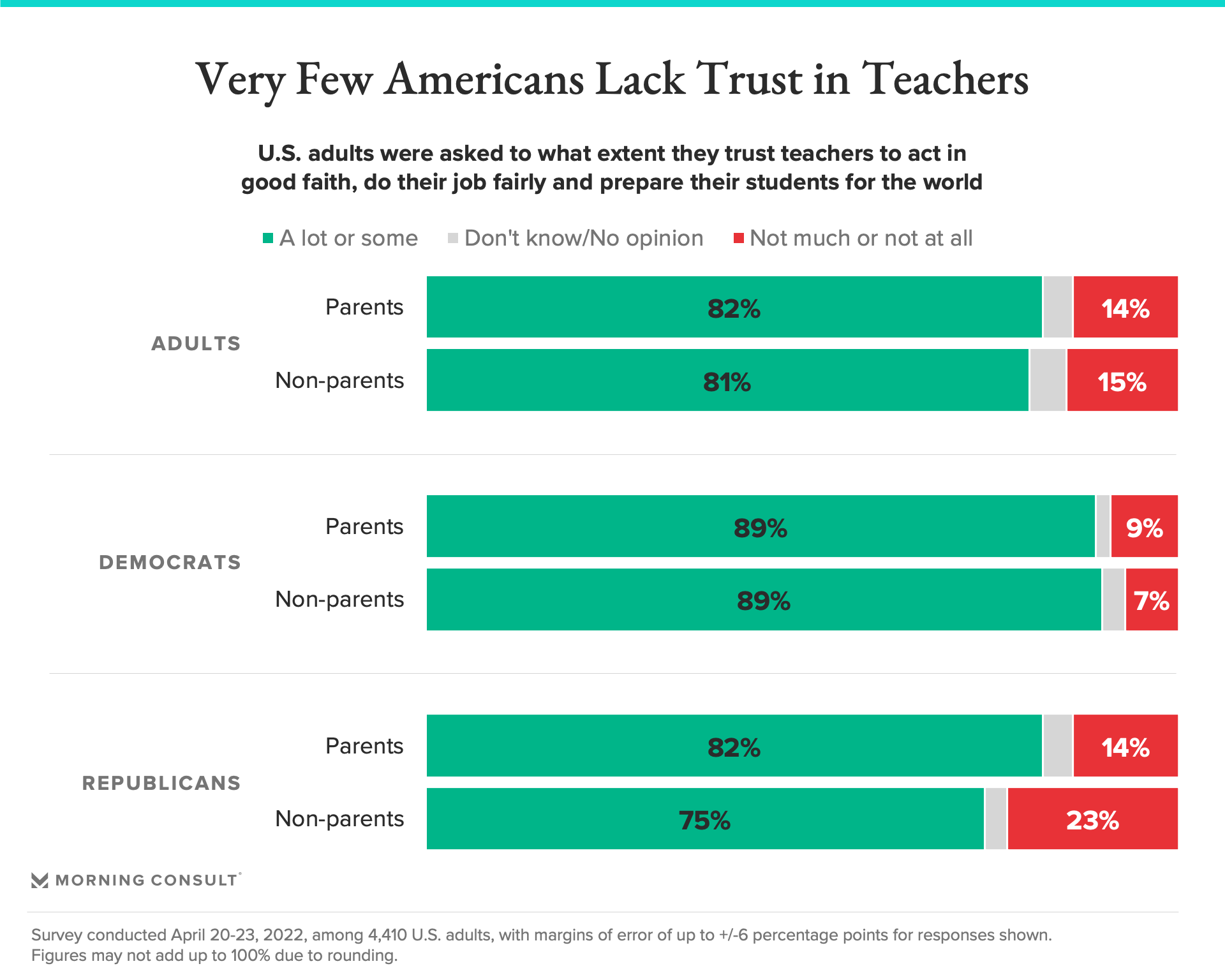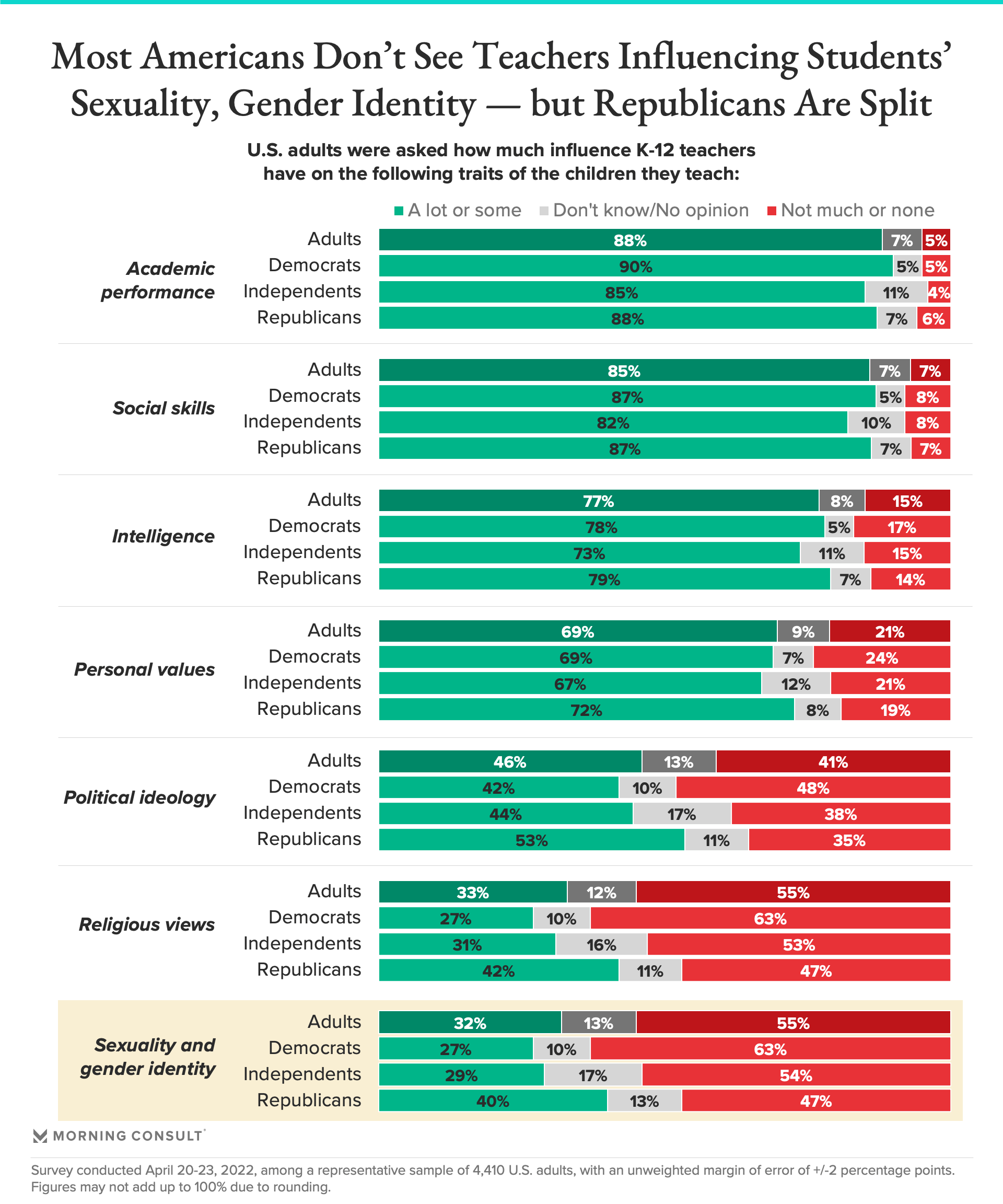 While most Americans — including 82% of Republican parents — trust teachers to “act in good faith, do their jobs fairly and prepare their students for the world,” the GOP’s focus on LGBTQ topics in the classroom could capitalize on declining trust in the public education system, especially among Republicans, who are more likely than the broader population to believe classroom instructors have influence on children’s values and their sexuality and gender identity.