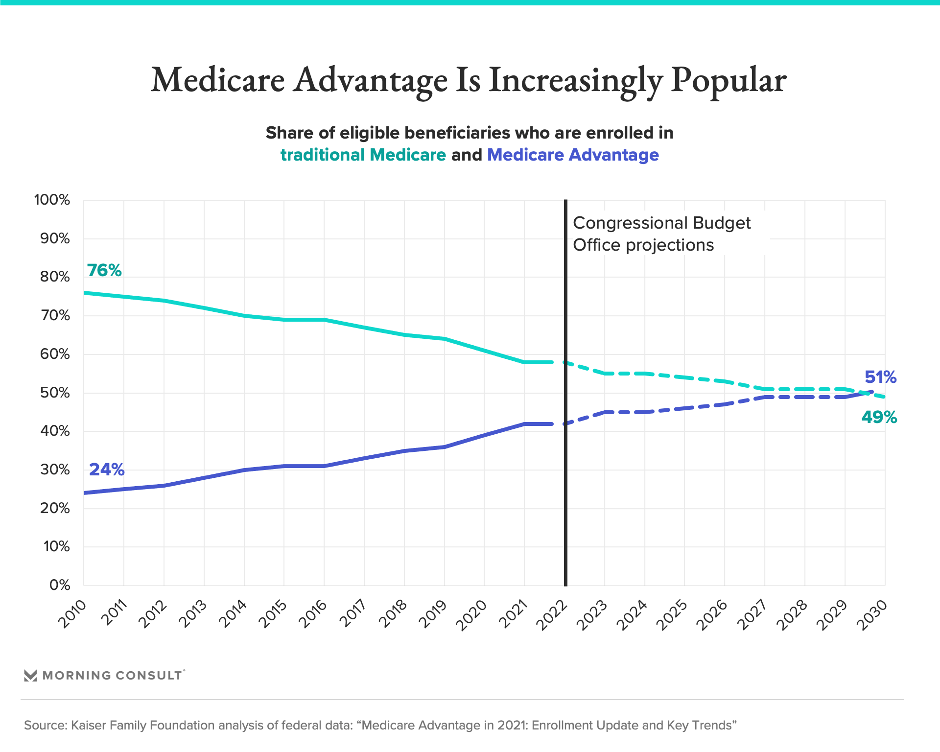 The Congressional Budget Office projects that by 2030, at least half of eligible beneficiaries will be enrolled in Medicare Advantage, where the federal government pays private insurers a lump sum per patient to keep them healthy, rather than paying for each medical service, with those payments adjusted for various risk factors. Other experts estimate that the country will cross the 50 percent threshold even sooner — and a handful of states are already there as of February 2022, a Morning Consult analysis of federal data shows.