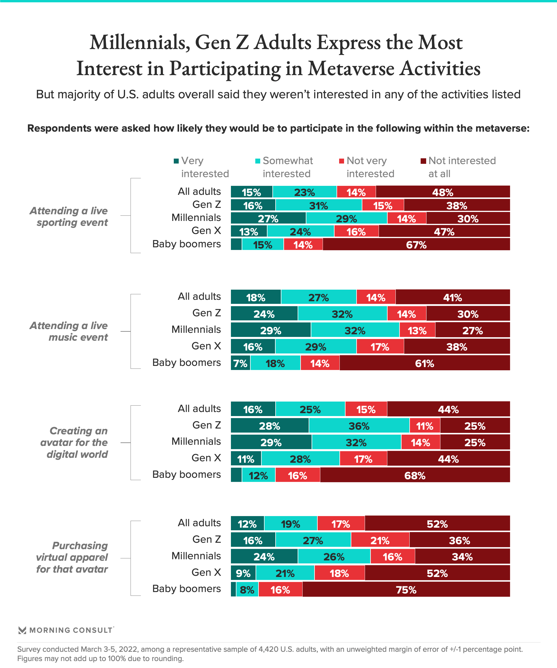 - Meanwhile, 64% of Gen Z adults said they were interested in having a digital avatar and 56% said they would be interested in attending a music event in the metaverse. They were noticeably less interested in attending a metaverse-based sporting event. (Notably, previous Morning Consult research has shown that Gen Zers are less likely to identify as sports fans compared to other generations).