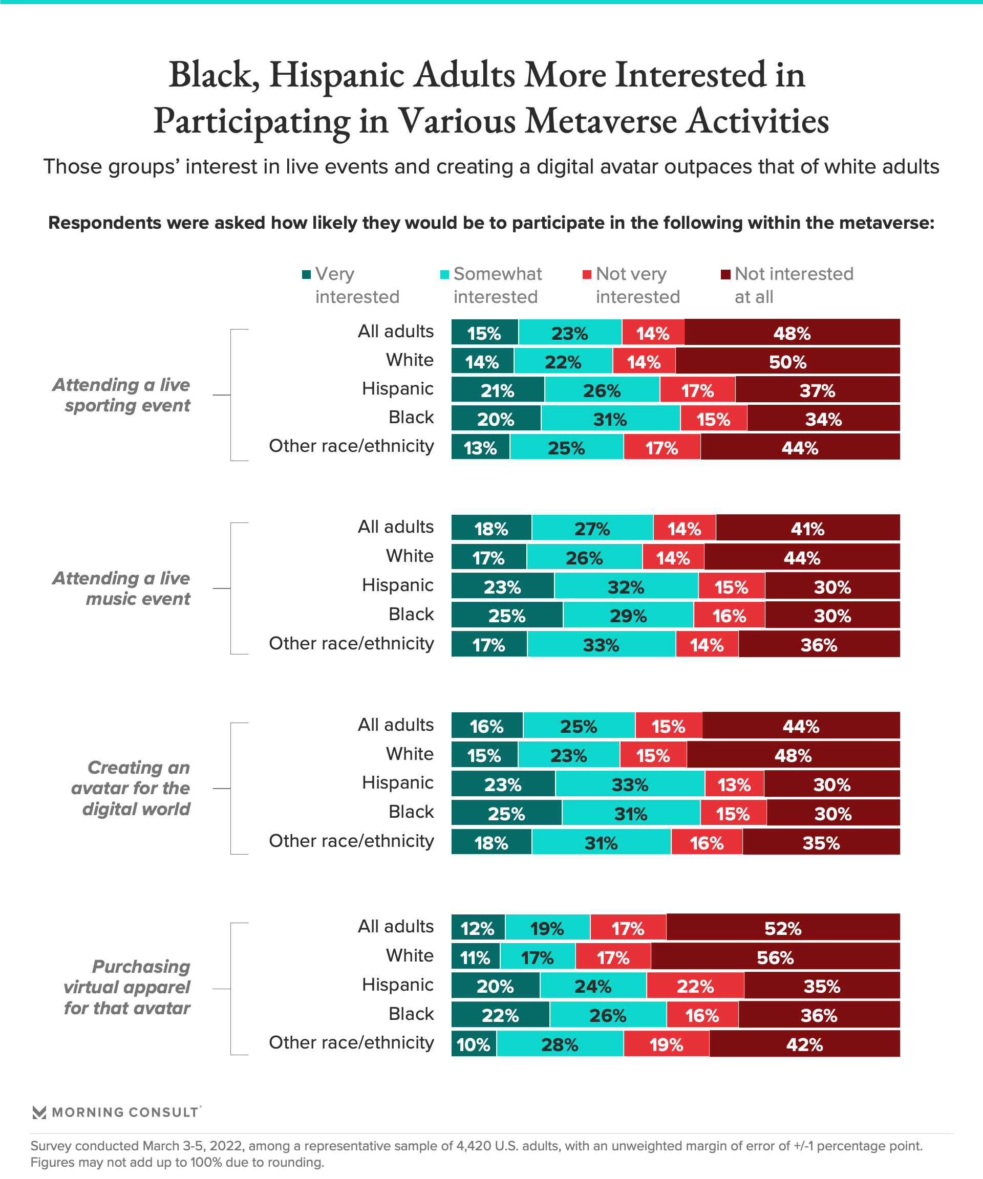 - Roughly half of Black adults said they were interested in attending a live sporting event (51%) or live music (54%), while comparable shares expressed interest in creating a digital avatar (56%). Hispanics were similarly interested in attending a live music event in the metaverse (55%) and creating a digital avatar (56%). Both groups outpaced white people in their interest in these activities.