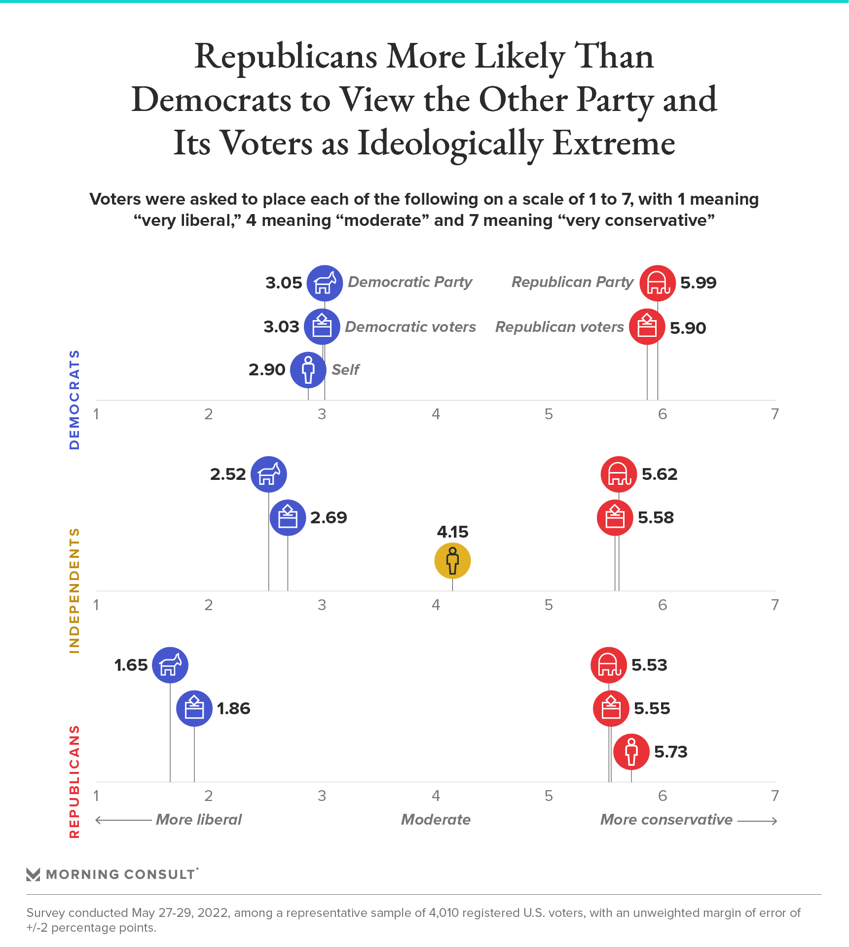 But Trump’s diminished direct role on the political stage suggests Democrats will have a tougher time wielding negative partisanship to motivate their base for the stretch run of this year’s midterms. The tallness of that task is underscored by new Morning Consult research, which shows that voters on the right are more likely than those on the left to view the opposing side as ideologically extreme and acting in bad faith. However, Democrats may be able to find fruit in the Republican Party’s vocal extremes to motivate voters in the middle, who are more likely to see Republicans as a bigger threat to functioning democratic norms.