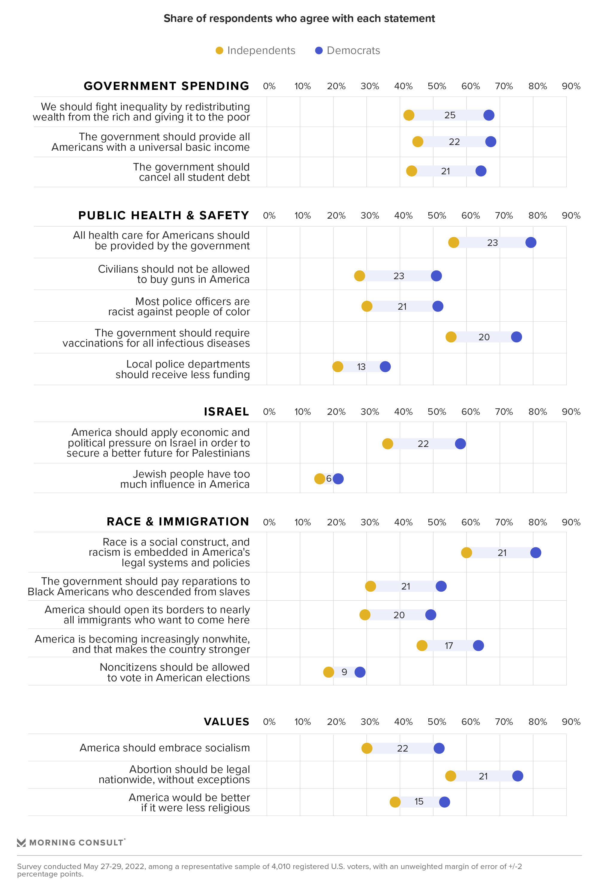 Very few independents agree that America should open its borders to nearly all immigrants who want to come here or that civilians should not be allowed to buy guns in America, views that are held by roughly half of Democratic voters. Independents are even further away from the GOP when asked whether they believe the LGBTQ movement is corrupting children or that all immigrants who came into America illegally should be deported.