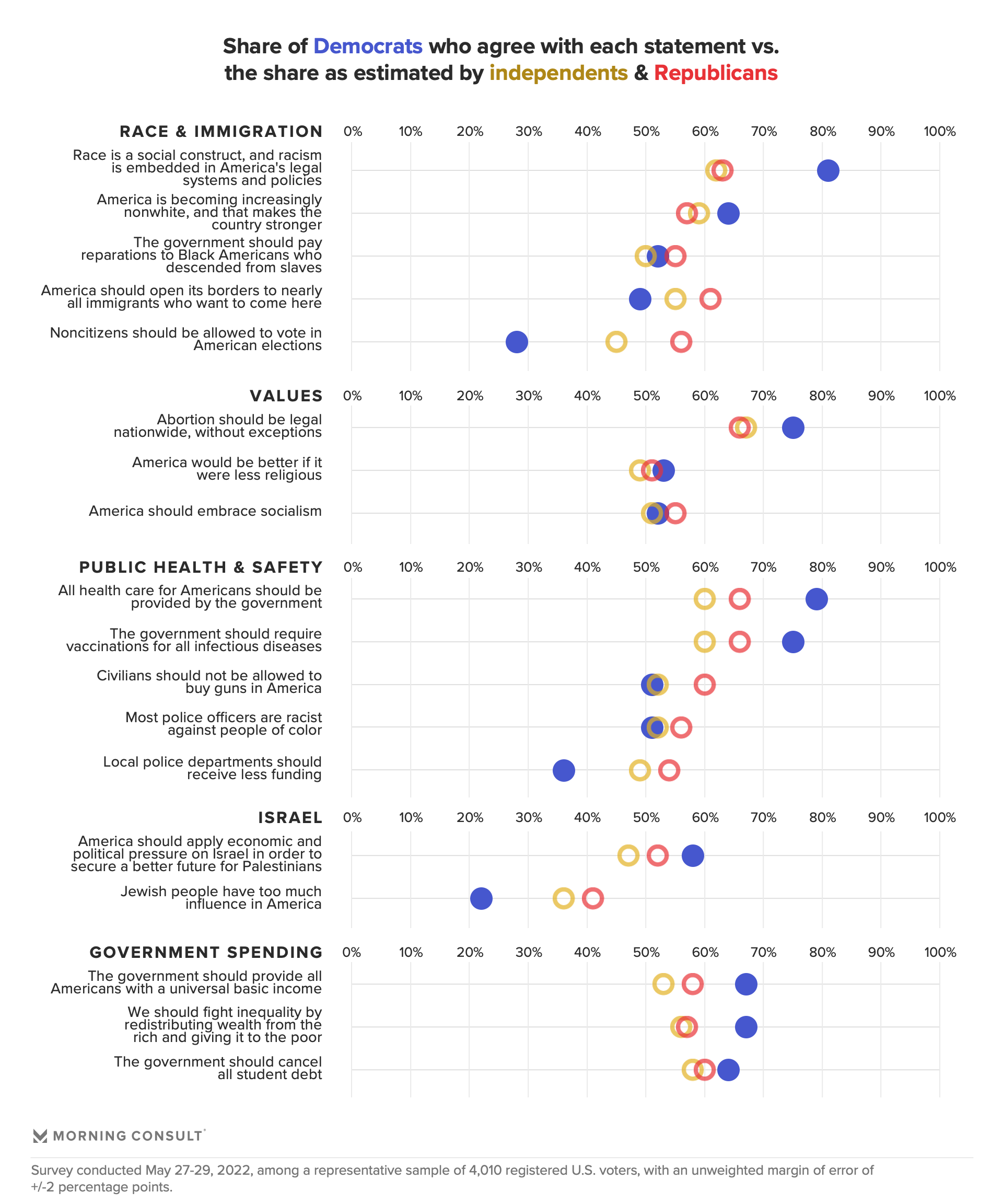 Democrats underestimated the share of Republicans who believe all Americans should be taxed at the same rate and overestimated the share who believe abortion should be illegal nationwide without exceptions.