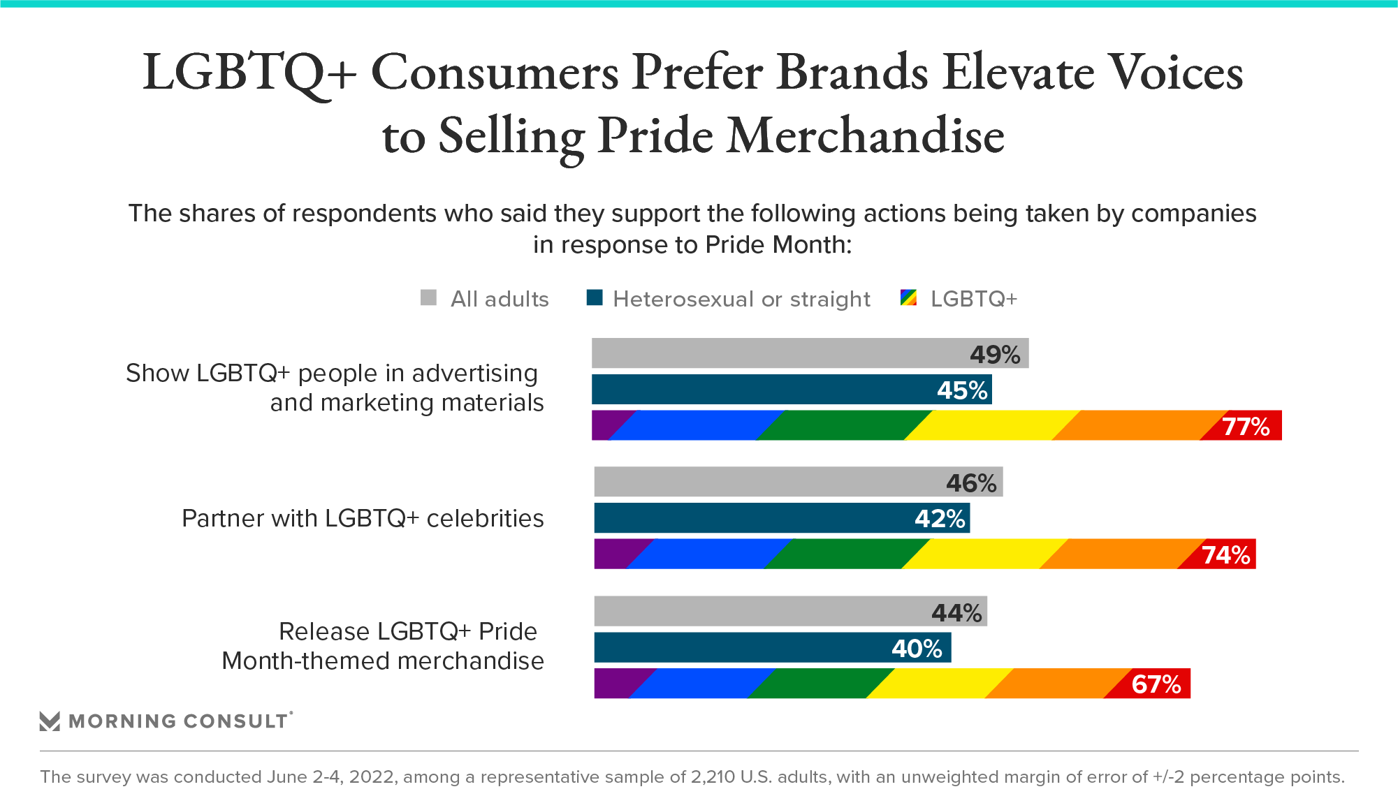 That's 10 percentage points higher than the share of LGBTQ+ adults who support when companies release LGBTQ-themed merchandise for Pride Month.