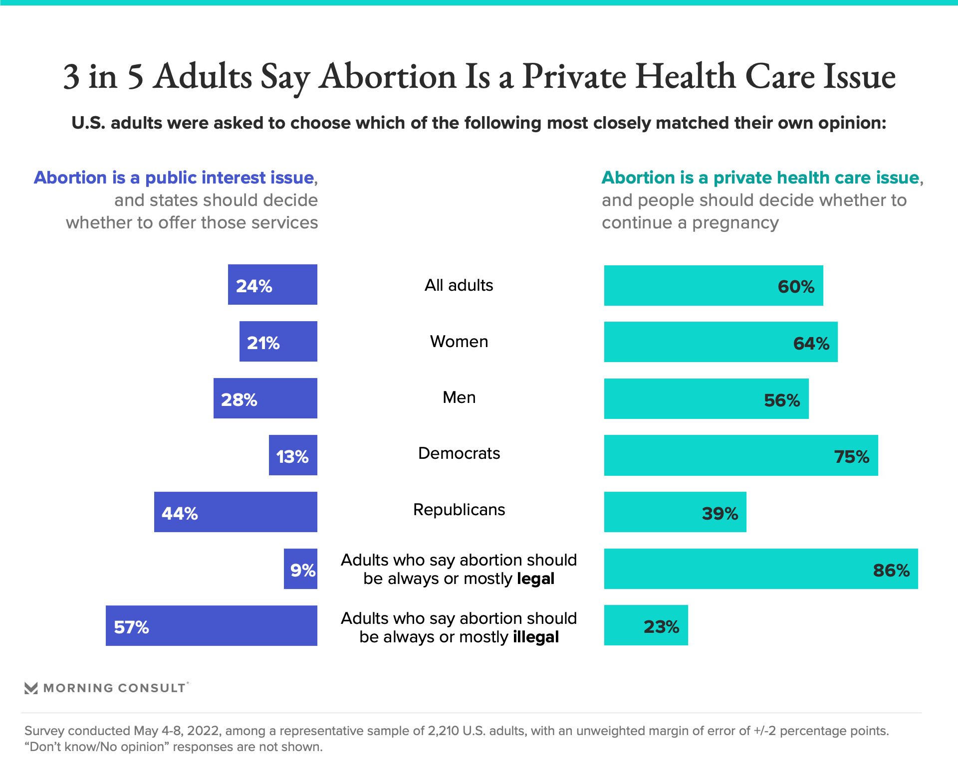 In the survey, 3 in 5 adults said abortion is a private health care issue and people should have the right to decide if they want to continue a pregnancy, compared with 24% of adults who said it's a public interest issue and states should be able to decide whether to offer abortion.