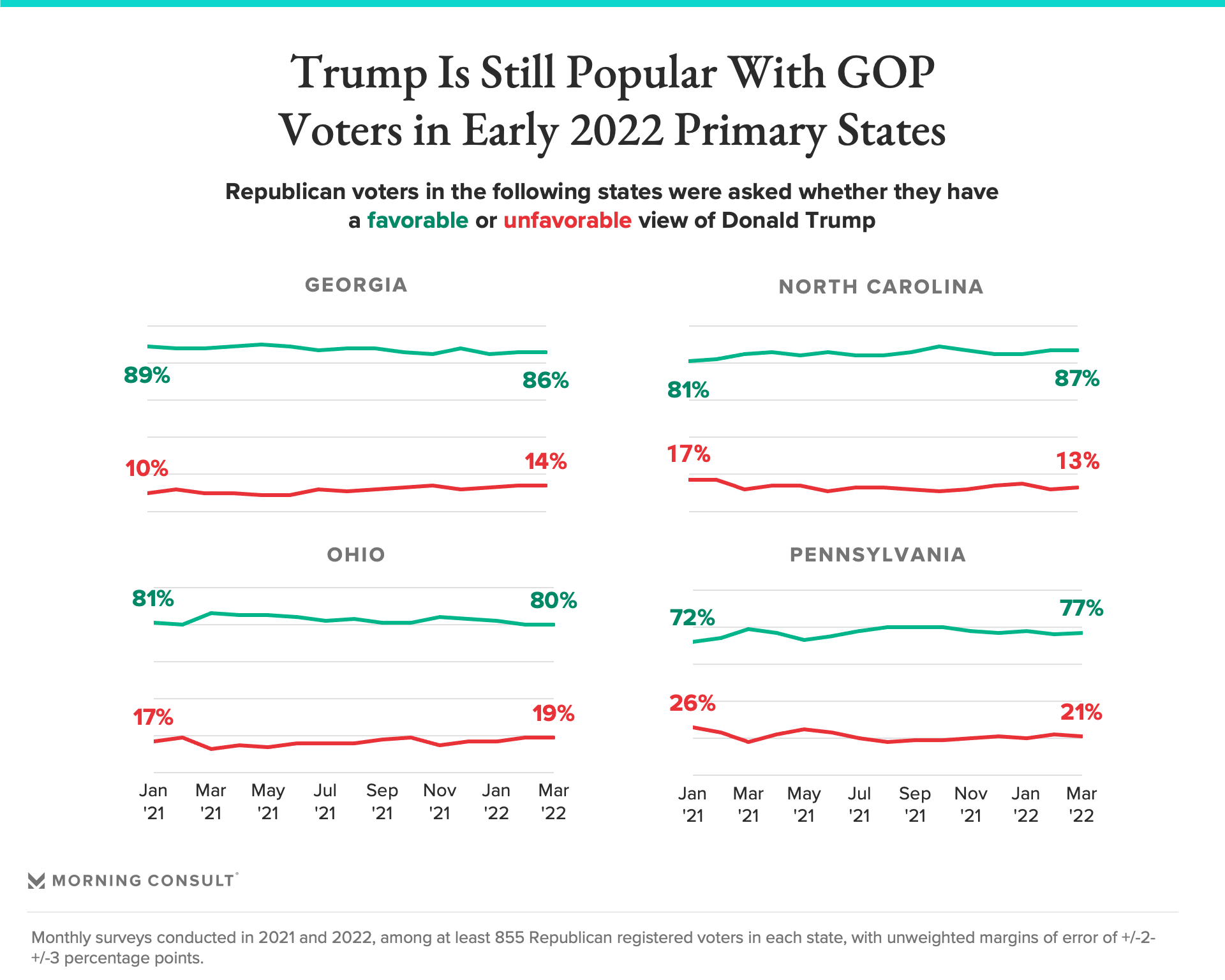 Roughly 4 in 5 Republican voters in the early primary states of Georgia, North Carolina, Ohio and Pennsylvania hold favorable opinions about the former president, according to Morning Consult surveys conducted in March.
