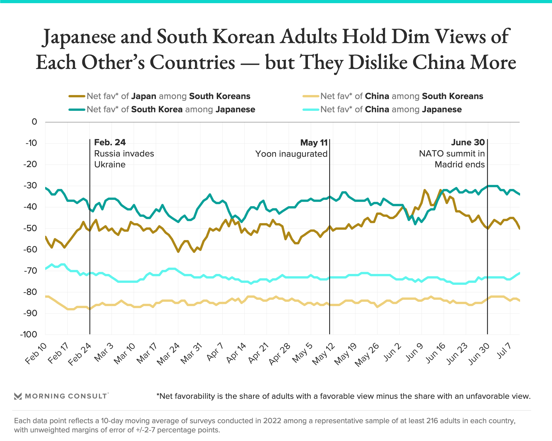 The mutual resentment is clear in Morning Consult survey data, with adults in each country markedly more likely to view the other negatively than positively. But that pales in comparison to their views of China: Close to 9 in 10 South Koreans and 8 in 10 Japanese hold Beijing in disfavor.