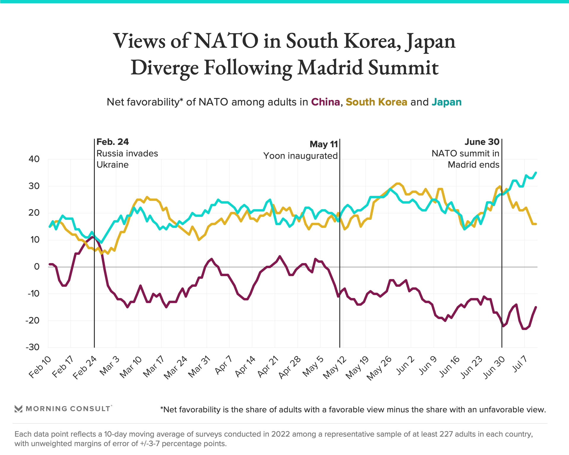 Morning Consult’s global survey tracking shows Yoon’s approval rating in South Korea fell 11 percentage points since just before the June 28-30 summit — to a painful 28%. Kishida, on the other hand, experienced a 3-point bump to 43%. (The July 8 assassination of Kishida’s predecessor and mentor, Shinzo Abe, likely contributed to the small increase.)