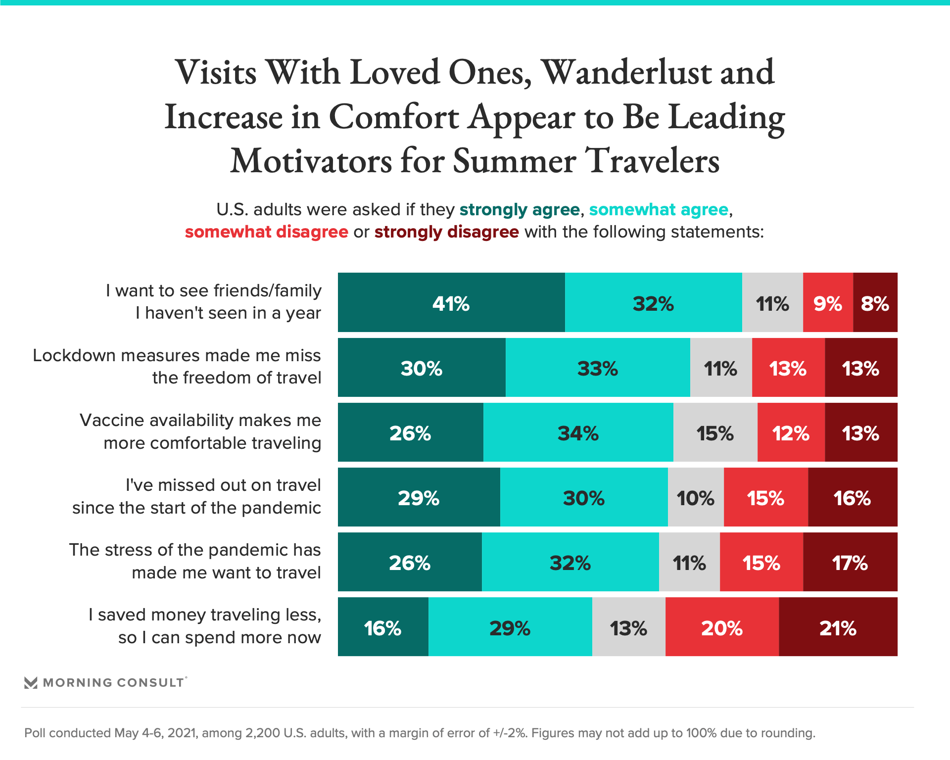 Desire to see friends and family, vaccine availability leading to an uptick in comfort, pandemic-related stress and the general feeling of having missed out on travel for the past year all seem to be motivating Americans to book trips this summer.