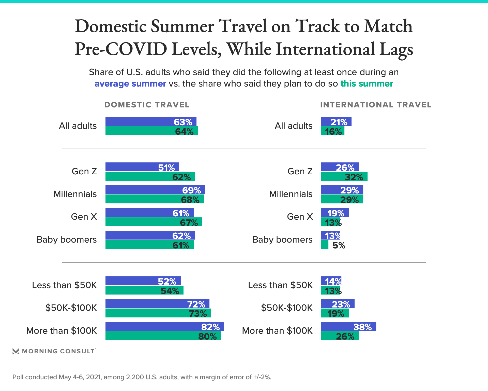 Higher-income Americans also typically participate in international travel more so than those who earn less, but fewer people in the high-income bracket are planning to travel out of the country this summer than who typically did pre-pandemic, which could be contributing to the slower return to growth for international travel compared to domestic.