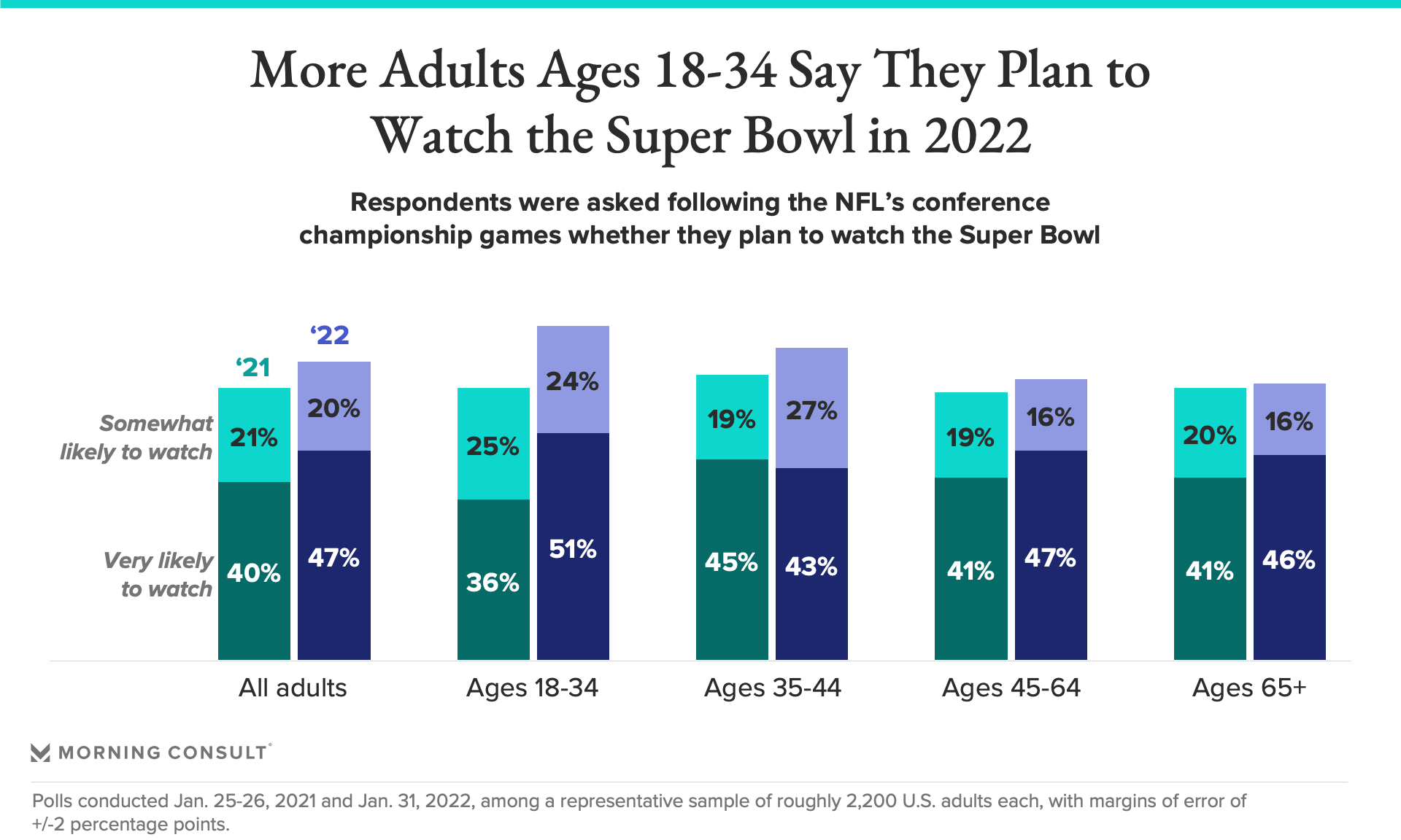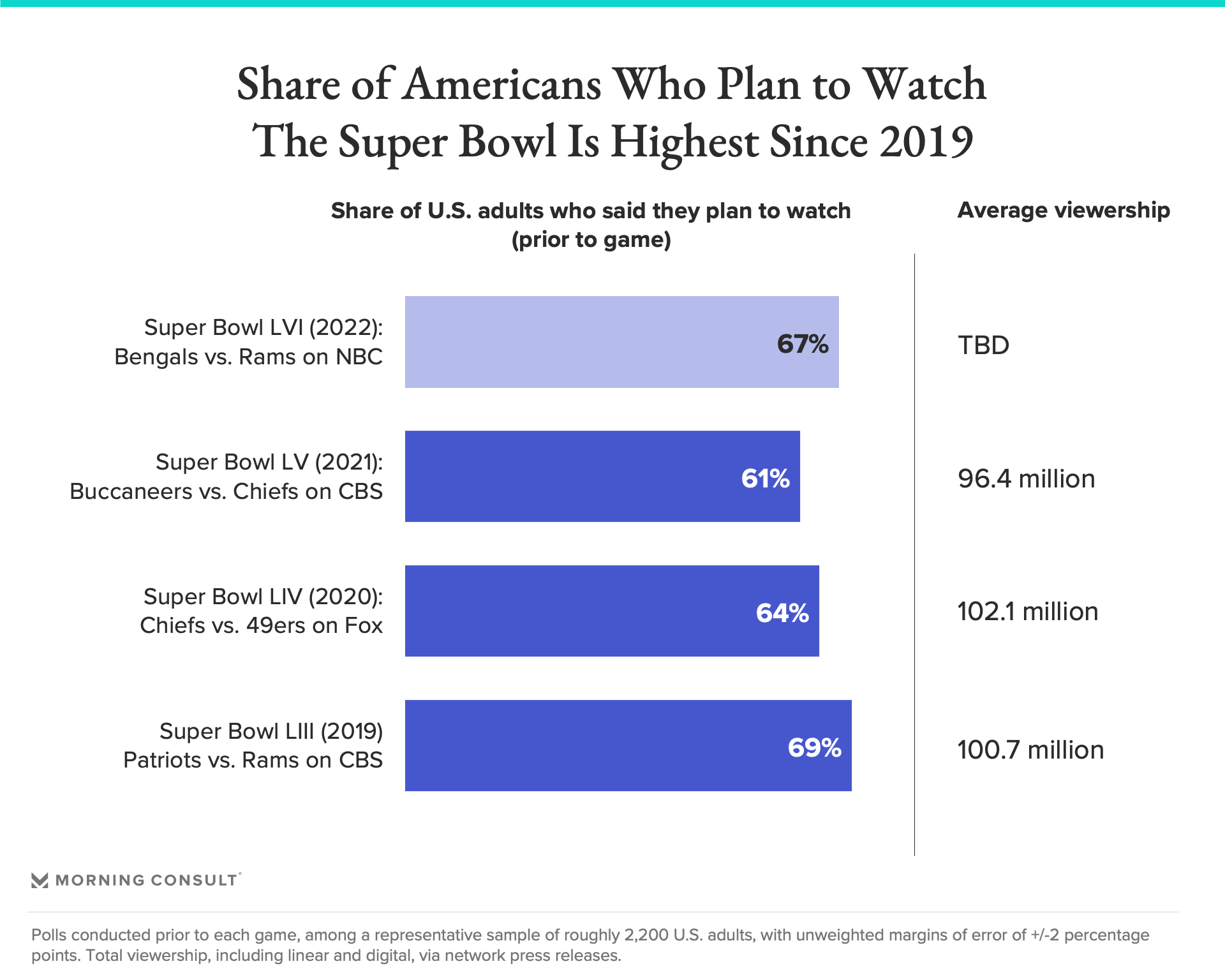 - Sixty-seven percent of U.S. adults said last week that they plan to watch Super Bowl LVI, an increase from the 61 percent of respondents who said they planned to watch last year’s game between the Tampa Bay Buccaneers and Kansas City Chiefs. According to Nielsen viewership data, Super Bowl LV on CBS produced the smallest total audience for the NFL’s championship game since 2007 and the smallest TV-only audience since 2006. (Nielsen subsequently admitted that it inadvertently underreported out-of-home viewership for live events in 2020 and 2021, but it’s unclear whether or not this impacted the Super Bowl specifically.)